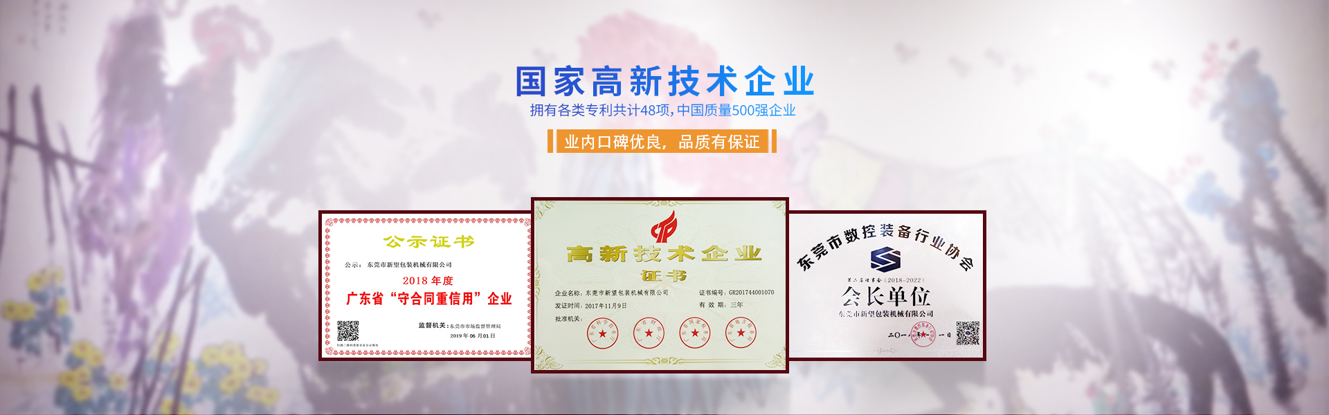 新望機械成立于1998年,位于東莞市東部工業園區的中心地帶——企石鎮東平村,交通方便、環境優美舒適、視野開闊。公司注冊資本2000萬元,擁有辦公室、廠房等18,000多平方米。已通過ISO9001:2015國際質量管理體系認證,擁有國家各類專利共計58項。是東莞市企石鎮工商聯副會長單位、東莞市企石鎮文學藝術界聯合會副主席單位、東莞市環保包裝行業協會副會長單位、東莞市數控裝備行業協會第二屆會長單位、廣東省包裝技術協會常務理事單位、廣東省膠粘劑行業協會理事單位、廣東省著名商標企業、國家高新技術企業。